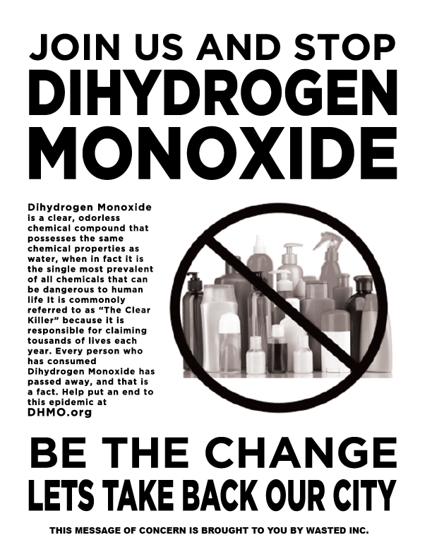 Dihydrogen Monoxide Flyer: This flyer uses the scientific term for water to make it seem as if its harmful and or scary. Text is utilized to share plenty of information as if it is rallying for change, and uses clever wordage that's technically correct when pertaining to water.